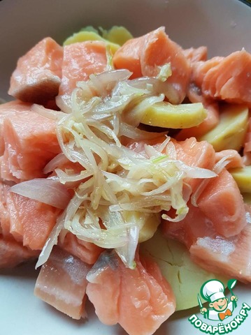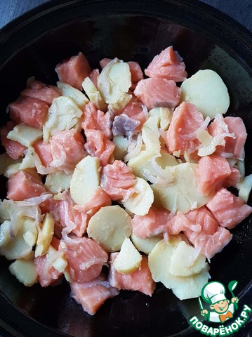 Аккуратно перемешать зажарку, картофель и рыбу. Слегка посолить. -