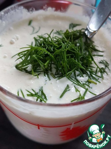 В сливки добавить муку, перемешать, чтоб не было комочков + нарезанный укроп. -