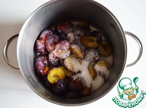 Горячий сироп и набухший желатин вылить в сливовое пюре, хорошо перемешать, чтобы желатин растворился.