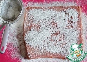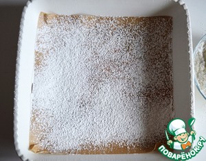 Квадратную форму размером 20*20 застилаем пекарской бумагой и присыпаем тонким слоем смеси сахарной пудры и кукурузного крахмала.