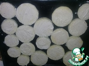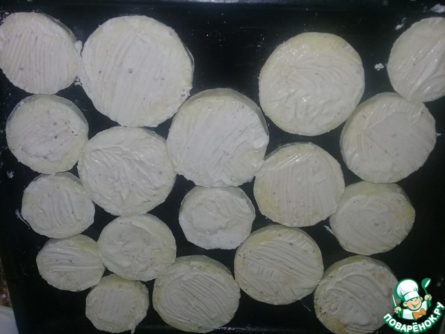 Сверху разложить нарезанные сосиски, смазать майонезом, смешанным с чесноком и сыром.