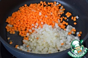 Морковь и лук нарезать мелким кубиком и обжарить овощи в растительном масле 3-4 минуты, помешивая (огонь активный)