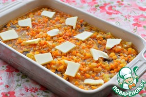 Сливочное масло нарезать пластинами и выложить его поверх овощей.