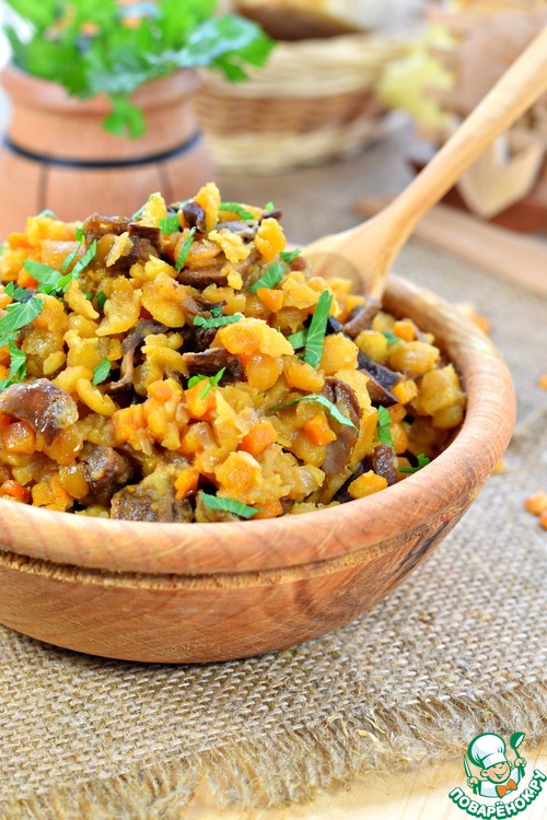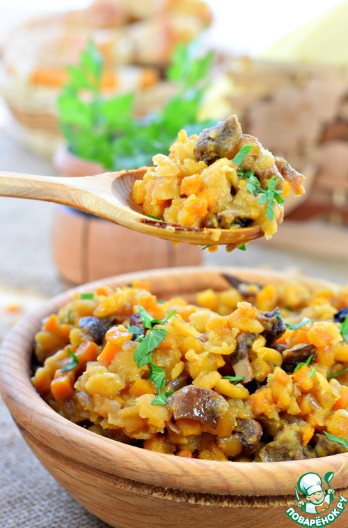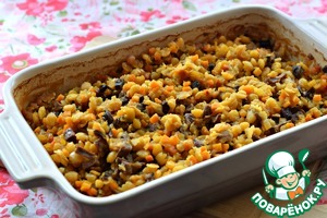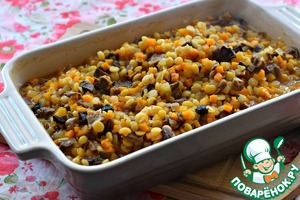 Гороховая каша с овощами и сухими грибами. Ароматная, рассыпчатая, вкусная. Готовится блюдо практически без вашего участия, достаточно сложить все ингредиенты в форму для запекания и поставить ее в духовку.