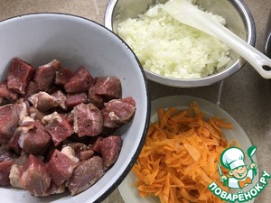 Мясо хорошо вымыть, просушить и порезать крупными кубиками. Лук мелко измельчить (я это сделала при помощи комбайна), морковь натереть на крупной терке.