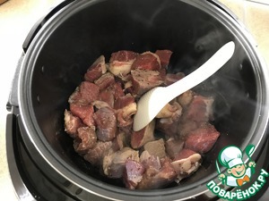 Выбираем режим "Жарка" (30 мин.). Растапливаем масло, выкладываем мясо и обжариваем. Крышку МВ не закрываем! Периодически перемешиваем мясо.