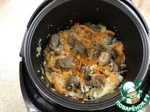Как только жидкость почти испарится, добавляем морковь и лук. Перемешиваем, крышкой не закрываем. Ждем окончания программы.