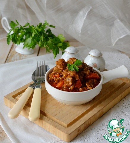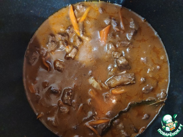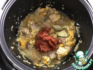 Посыпаем мясо с луком и морковью мукой, перемешиваем, вливаем 400 мл. воды или бульона, солим, перчим, добавляем томатную пасту, лавровый лист. Перемешиваем. Закрываем крышкой. Выбираем режим "Тушение", выставляем время 1ч 30мин.