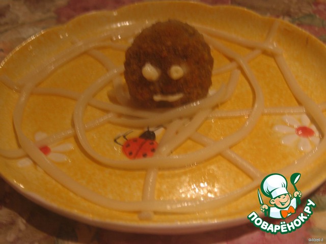 Этот рецепт специально для храбрых маленьких рыцарей, которые не побоятся сразиться (и быстренько уничтожить) паука-злодея.. Хотя получился он не такой уж и злой, скорее забавный. Похожую идею нашла на просторах нета.. съедается просто мгновенно под любимую сказку Чуковского ...