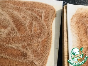 Испечь в духовке, потом его перевернуть на решетку, когда будет готов. Следующие 2 листа (разрезанные)положить на пекарскую бумагу. -