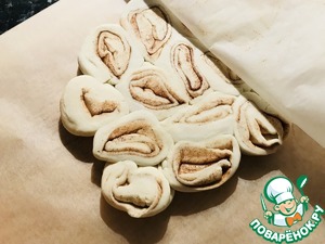 У нас останутся рулетики, эти рулетики сложить вместе и раскатать скалкой и сверху на яблоки постелить.