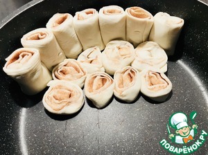 Свернуть в рулет и порезать на кусочки размером 5-6см и кусочки более короткие.