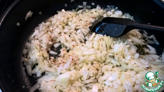 Пассеруем лук и красный жгучий перец в оливковом масле