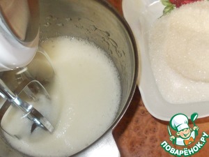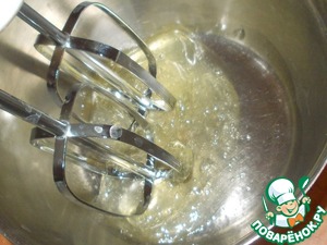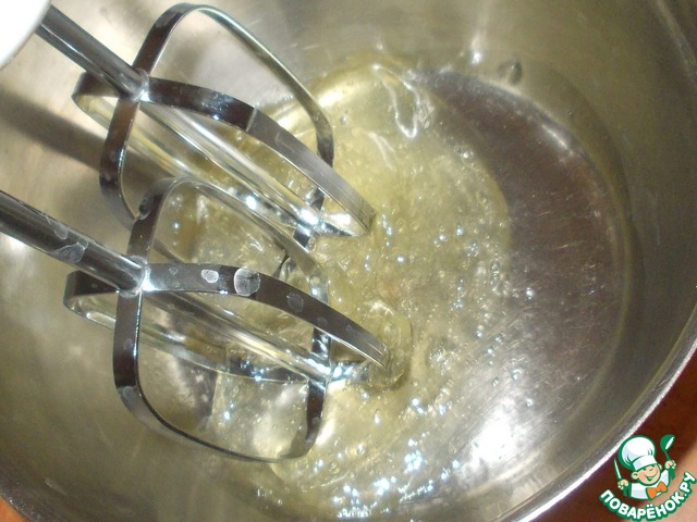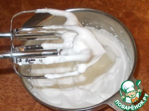 Взбиваем до крепкой пены, которая не спадает с венчиков и не съезжает в миске при переворачивании.