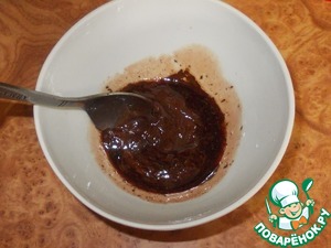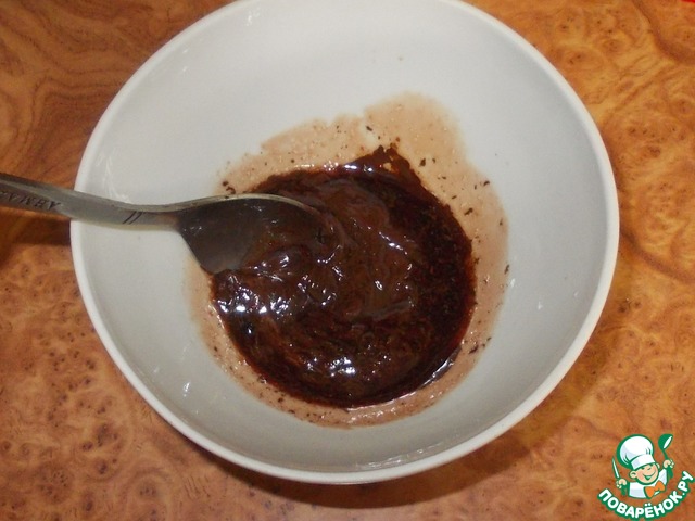 Займемся глазурью. Самый простой способ сделать глазурь это растопить в микроволновке шоколад... Для этого кладем его в подходящую посудину, поливаем соком и добавляем растительное масло. Масло надо для того, чтоб глазурь не застыла при извлечении из печи. Растительное масло можно заменить сметаной, молоком или сливками.