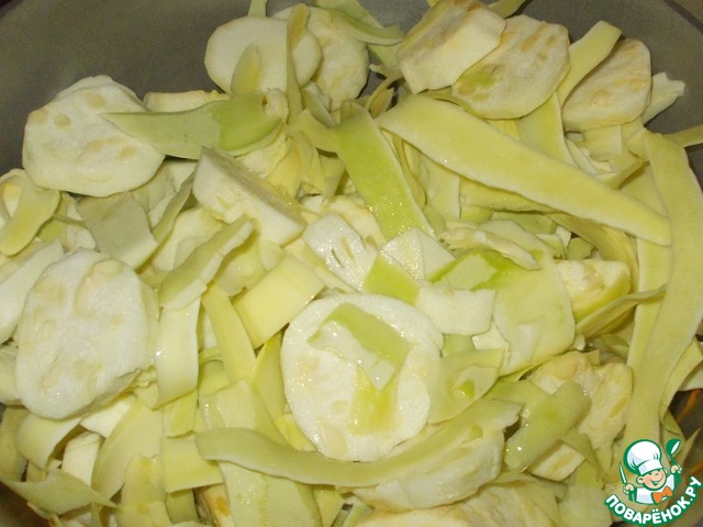 Затем туда же очистки кабачков и накрываем плотно крышкой. Огонь сильно большой не делаем, чтоб не подгорело!