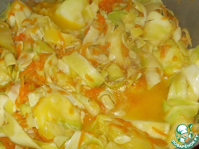 Минут через 15-20 крышку снимаем и перемешиваем овощи. Видим, что кабачки пустили уже немного сока. Накрываем снова крышкой и забываем смело на пол часа.