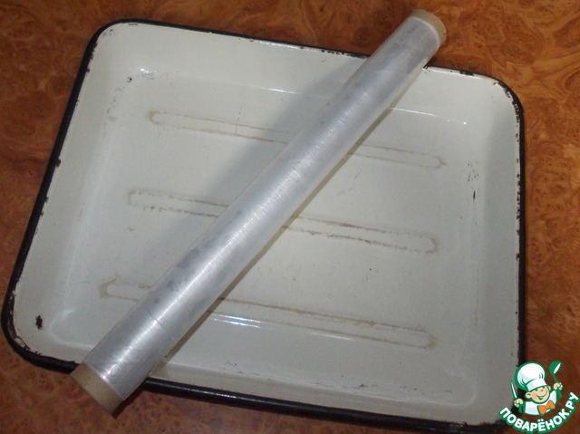 Перекладываем на поддон и разравниваем. Слой получается толщиной около 2 см. Сверху затягиваем пищевой пленкой и отправляем в морозилку.