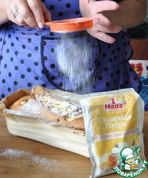 Готовый кекс посыпать сахарной пудрой (у меня Haas с ароматом ванили).