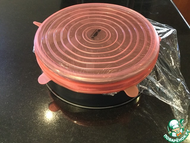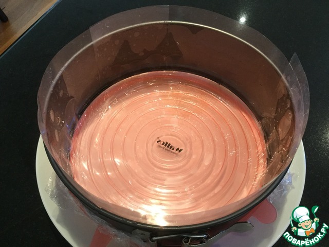 Пока филе курицы варится приготовим форму. У меня разъёмная. Для большей безопасности дно закрываем пленкой чтобы жидкость не протекла и я одела ещё крышку