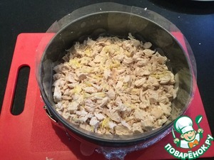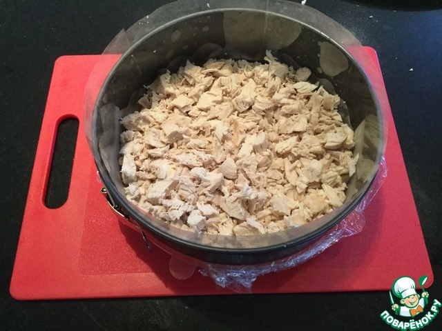 Отварную курицу порезать небольшими кубиками и выложить на дно формы слоем примерно 4 сантиметра
