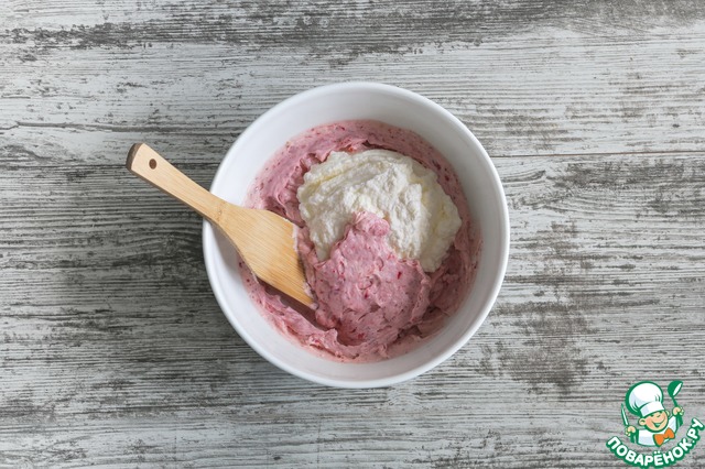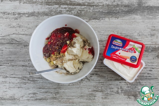 Смешайте творожный сыр с клубничным сиропом, ванилью, лимонной цедрой и соком до однородности.