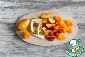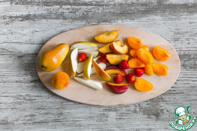 - Ассорти фруктовое (по 300 г слив, персиков, клубники и груш для подачи)