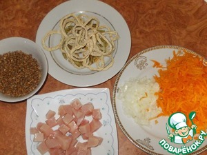 Подготавливаем ингредиенты. Оговорюсь сразу по поводу сушенного кабачка, если таких кабачков Вы не заготавливали еще, то в суп добавляйте пару картошин нарезанных кубиком, либо несколько резаных стручков фасоли, либо около 100 г сырого кабачка нарезанного кубиком, но сушенный дает ощущение того, что суп с грибами. Вместо грибной приправы можно использовать грибную травку и соль по вкусу, но если Вы с такой не сталкивались, то подготовьте к добавлению в суп обычную грибную приправу. Гречку перебрать и промыть, лук мелко нарезать, морковь натереть на терку, филе режем не крупным кубиком. Кабачки сухие я в этот раз не резала, но лучше нарезать на кусочки.