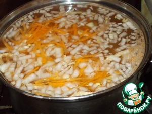 Закладываем все это в двухлитровую кастрюлю и заливаем водой (около 1,5 л). Ставим на огонь. Доводим до кипения.
