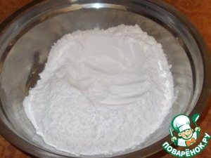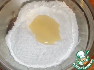 Тем временем в миску просеиваем сахарную пудру (обычно уходит 200 г, но лучше иметь в запасе еще примерно 50 г). Делаем в центре углубление
