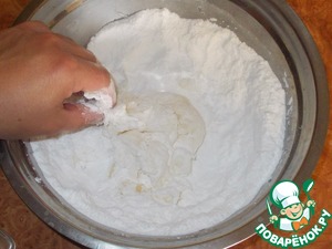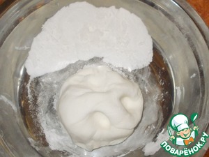 Когда жидкие фрагменты уже поглотили какое-то количество сахарной пудры можем продолжить замес рукой.
