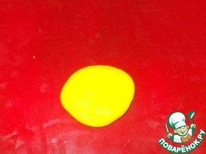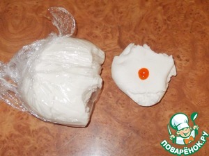 По истечении указанного времени можно приступать к работе с мастикой! Если надо ее затонировать, то отрываем необходимое количество мастики, капаем краситель и вмешиваем.