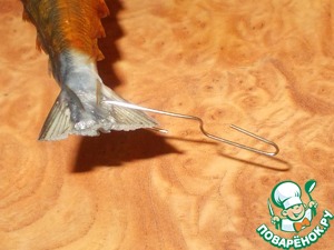 Через 3-4 дня рыба готова к употреблению. Маринад выливаем. Рыбу споласкиваем. За хвостик цепляем скрепку.