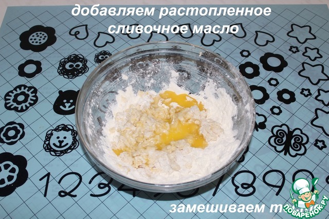 Добавляем подошедщие дрожжи и 30 гр растопленного сливочного масла. Замешиваем тесто.