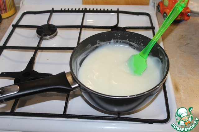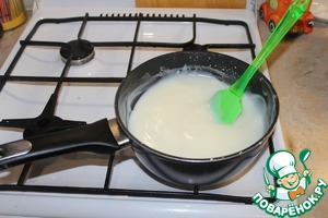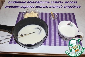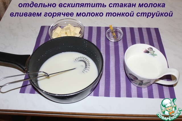 Отдельно вскипятить стакан молока. Вливаем горячее молоко тонкой струйкой.