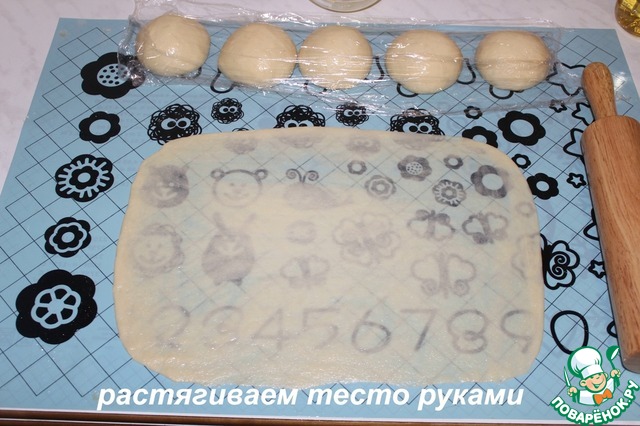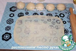 Растягиваем тесто руками.