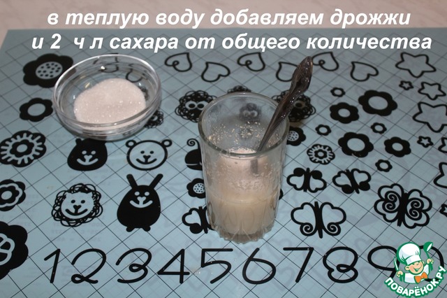 Готовим тесто. В теплую воду добавляем дрожжи и 2 ст л сахара от общего количества.