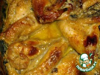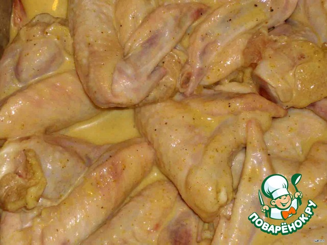 Полностью размороженные крылья заливаем соусом. Соус: горчица, сливки, мед, специи. Забываем на пару часиков. |
