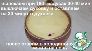 Выпекаем при 180 градусах 30 - 40 минут. Затем выключаем духовку и оставляем на 30 минут в духовке. После ставим в холодильник на 5 ч. Можно на ночь.