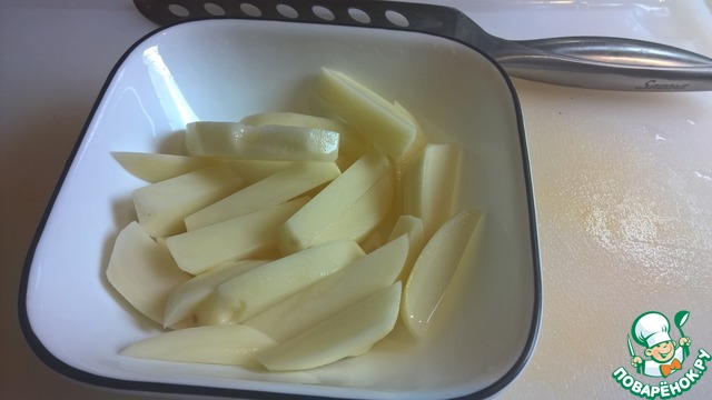 Чистим картошку и нарезаем соломкой. Хорошо промываем под холодной проточной водой, чтобы смыть крахмал. От крахмала ломтики картошки слипаются, поэтому его надо смывать