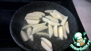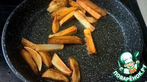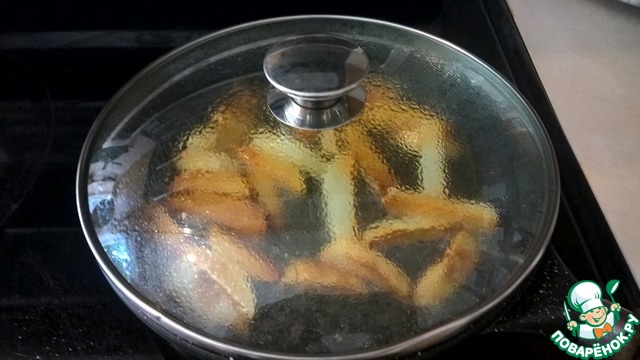 Выложив картофель - не трогаем его и даем образоваться корочке на нижней стороне ломтиков. Это будет заметно по покоричневению нижних частей боковых сторон - смотри фото.