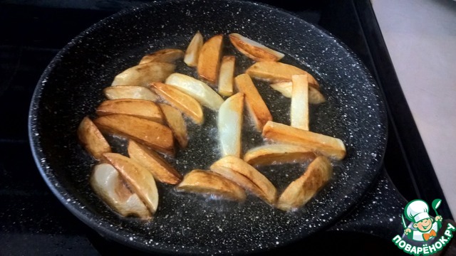 Существуют сотни, если не тысячи, рецептов жареной картошки. Этот рецепт довольно быстрого приготовления вкусной и нежной, но вместе с тем - зажаристой жареной картошки. Он, этот рецепт, образовался в процессе обобщения и осмысления довольно большого количества рецептов и подходов. В процессе приготовления поджаристой и мягкой жареной картошки есть два этапа: 1 - образование поджаренной корочки. 2 - доведение картошки до готовности. Поэтому начинаем мы с обжаривания ломтиков картошки на максимальной температуре, а затем уменьшаем нагрев до минимума и доводим ее до готовности. В общей сложности это занимает не больше 15 минут. Но давайте все по порядку..