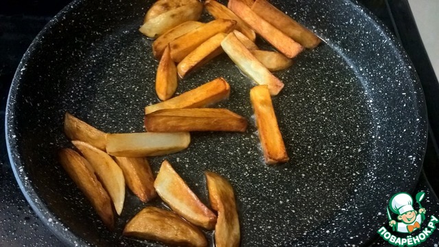Уменьшаем нагрев до минимального, накрываем крышкой и готовим минут 5 до мягкости картофеля. За счет предварительно сильно прогретой сквородки и масла, а также накрывания крышкой - процесс доведения до готовности происходит довольно быстро. При этом картофель снаружи покрывается хрустящей золотистой корочкой, а внутри становится нежно-мягким.