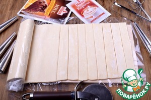 Слоеное тесто разложим на доске и нарежем полосками шириной 1,5-2 см