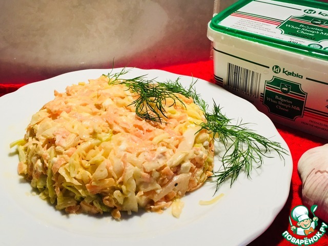 5. Выдавливаем чеснок в капусту, заправляем майонезом (у меня домашний). Майонеза нужно совсем немного, просто для соединения всех вкусов воедино.