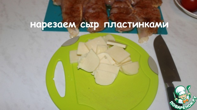 Нарезаем сыр пластинками.