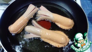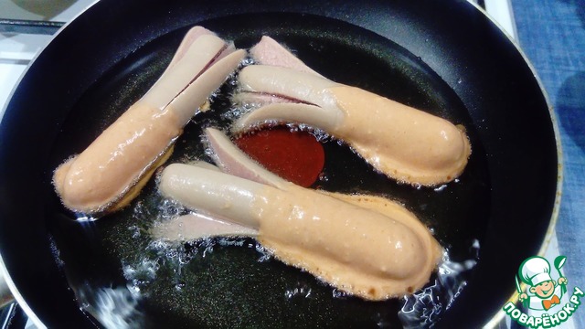 Пока греется сковорода займёмся нашими осьминожками. Обваливаем один конец сосиски в нашей мучно-томатной смеси, как показано на фото.