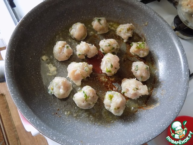 Формируем фрикадельки небольшие и выкладываем их на разогретую сковороду в масло. Обжариваем со всех сторон.