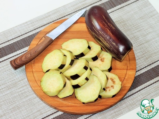 3. Баклажаны помыть, очистить от кожицы, нарезать кружочками. Сладкий перец запечь в духовке или в микроволновке, охладить и очистить от шкурки и семя. Помидор опустить в кипяток, извлечь, охладить и очистить шкурку.
