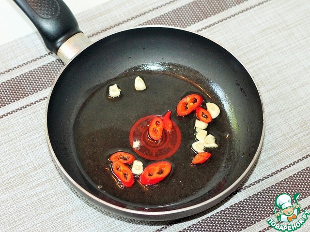 7. На разогретом растительном масле обжарить чеснок и острый перец до выделения аромата. Затем овощи удалить из сковороды, масло оставить.